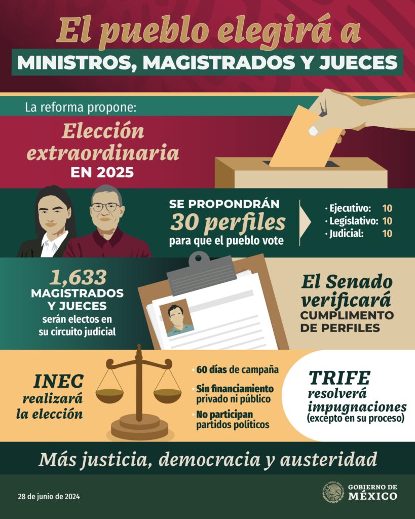 La reforma lo qué realmente propone es qué en el año 2025 ministros, magistrados y jueces de la suprema corte sean elegidos por el pueblo. Entonces en la elección se propondrían 30 perfiles entre el ejecutivo, legislativo y judicial además qué los magistrados y jueces de circuito serán elegidos en su mismo circuito.